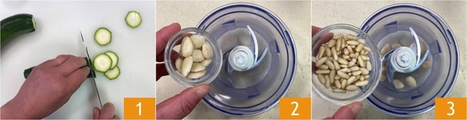 To make the risotto with zucchini pesto and goat cheese, first prepare the Vegetable broth and keep it warm for the rice cooking. Focus on the zucchini pesto: wash and trim the zucchini, then roughly slice them into rounds 1. In a blender, add the almonds 2 and pine nuts 3.