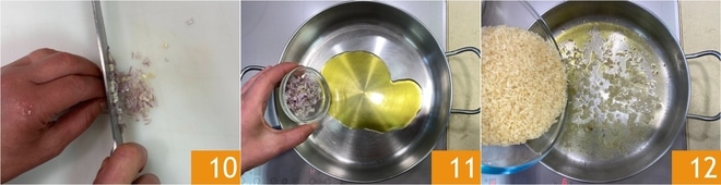 Clean and finely chop the shallot 10, then brown it in a large pan with a little oil 11; you can add a bit of broth to help you. Once wilted, add the rice 12 and toast it for a few minutes, stirring with a wooden spoon.