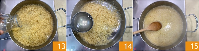 When the grains are hot to the touch, deglaze with the white wine 13 and let the alcohol evaporate completely. Add a ladle of hot broth 14 and cook the rice by adding the broth little by little as it is absorbed; it will take about 10 minutes 15.