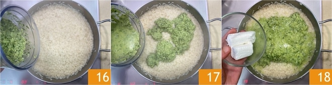 Once cooked, turn off the heat and add the zucchini pesto 16, then rinse the container with a ladle of broth and pour it into the pan 17. Finally, blend in the goat cheese 18.