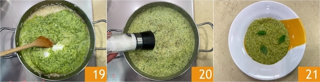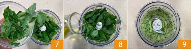 At this point, add the basil leaves 7 and the remaining oil 8, then blend again until you obtain a homogeneous mixture 9. Set aside the pesto and move on to cooking the risotto.