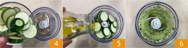 Add the zucchini as well 4 and half of the oil 5, then blend to create a cream 6.