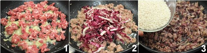To prepare the beer risotto with radicchio and sausage, start by finely chopping the radicchio and dicing the onion. Put the oil and butter in a pan, let it melt, then add the onion and let it soften over low heat for 10-15 minutes. Add the crumbled sausage 1 and let it brown, then add the radicchio 2 and let it wilt over gentle heat, stirring occasionally. Once the radicchio is wilted, add the rice 3 and let it toast for a couple of minutes