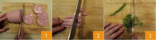 To prepare the beer and mortadella risotto, put a pot with plenty of salted water on the stove that you will use for the Vegetable broth. Slice the mortadella 1 and then cut it into rather small cubes 2 and set aside. Finely chop the rosemary 3