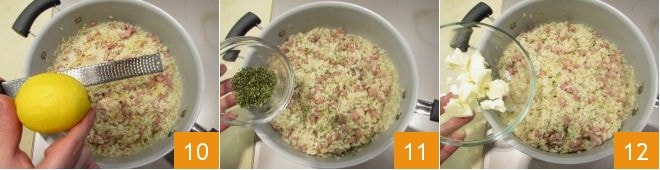A few moments before the end of cooking, add the grated lemon zest 10 and the chopped rosemary 11. Turn off the heat and finally cream with the butter 12