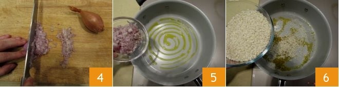 and the shallot 4; sauté the shallot in a large non-stick pot with the oil 5, then add the rice 6, letting it toast for 1 minute.