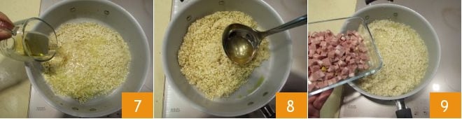 Deglaze with the beer 7, allowing it to evaporate. Let the rice cook, adding a ladle of vegetable broth from time to time 8, until the cooking is finished: it will take about 15 minutes. Halfway through cooking, add the mortadella previously cut into cubes 9.