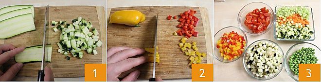 To prepare the vegetable risotto, first clean and trim all the vegetables: cut them into brunoise (very small cubes) (1-2). Make sure to cut all the vegetables to the same size so that they cook evenly. Once the operation is completed, set the vegetables aside 3.