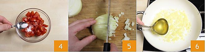 Cut the cherry tomatoes into wedges, place them in a bowl, and add a teaspoon of sugar 4, so that they lose their acidity. Chop the onion 5, and let half of it soften over very low heat in a large pan along with three tablespoons of oil and the butter; to prevent the onion from burning at this stage, you can add a ladle of broth 6.