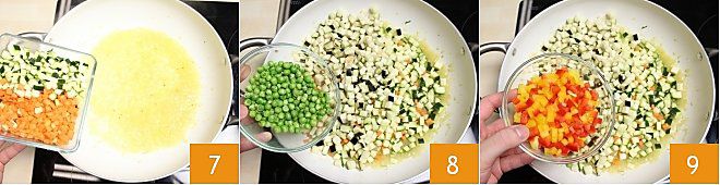When the onion becomes translucent (it will take about 15 minutes), add all the diced vegetables to the pan: the zucchini, half a carrot 7, the diced eggplant, peas 8, and bell peppers 9. Salt and pepper and let the vegetables cook for about 15 minutes, they should be soft but not mushy.