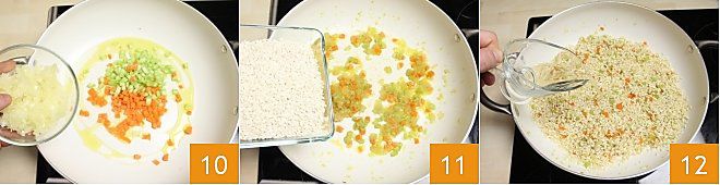 In another pan, How to make the soffritto in the remaining oil a mince prepared with the celery stalk, the other half of the onion, and the carrot 10. Again, let it go over low heat for about 10 minutes; to avoid burning the soffritto, you can add a ladle of broth here as well. Then add the rice and toast it together with the soffritto 11. Add the white wine 12 and let it evaporate.