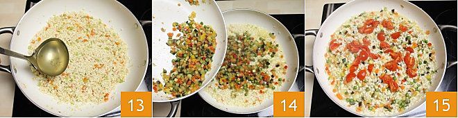 When the wine has evaporated, add a ladle of broth and let it cook, adding a ladle of broth from time to time 13, stirring constantly with a wooden spoon. When the rice is halfway cooked, salt and add the vegetables, which should now be cooked 14, and continue cooking the rice, always adding a ladle of broth from time to time. When the rice is cooked, also add the cherry tomatoes 15, mix everything well, and turn off the heat.