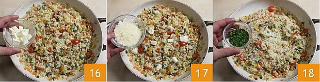 At this point, you can proceed to stir the risotto, turn off the heat, and add the butter 16, Parmesan cheese 17, chopped parsley 18, and add a grind of freshly ground pepper, give it a final stir and your vegetable risotto is ready for your table!
