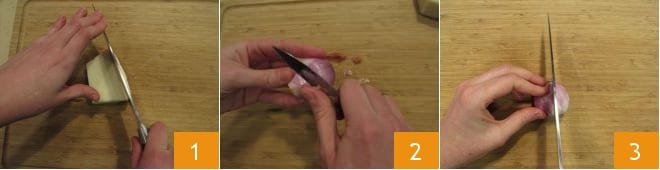 To prepare the cacio e pepe risotto, the first thing you need to do is make the broth: remove the rind from the pecorino 1 and set it aside. Peel the shallot 2, cut it in half 3.