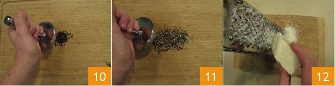 Meanwhile, place the peppercorns on a cutting board and crush them coarsely with a meat tenderizer (10-11). Then grate the Pecorino and set it aside 12.
