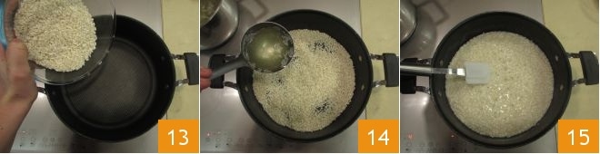 Pour the rice into a hot pan 13 and toast it dry, without adding oil or other fats 13, until you feel it burn when you touch it. At this point, start adding hot broth 14 and continue cooking this way, adding more broth as needed. Once the rice is cooked 15, turn off the heat.