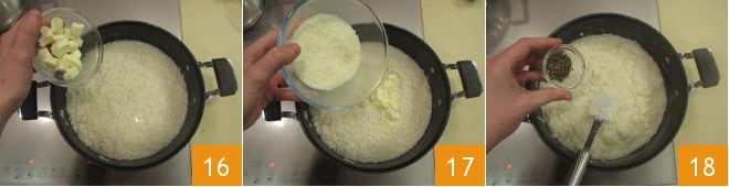 Stir in the butter 16, the Pecorino 17, and almost all the pepper 18, saving some for the final decoration.