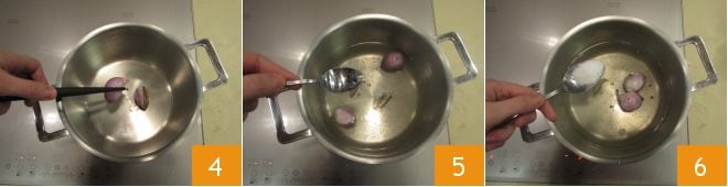 and toast it in the bottom of a hot pan 4. Then add the water, the pepper 5, and the coarse salt 6.
