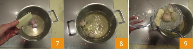 and the Pecorino rind 7. Let it simmer for 30-40 minutes 8, then using a fine-mesh skimmer, remove the shallot, pepper, and Pecorino rind 9.