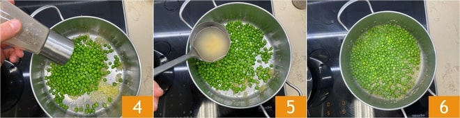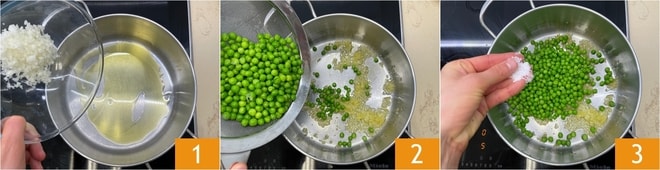 To prepare risotto with peas and mint, pour a splash of olive oil into a pan, add the chopped onion 1, and stew over low heat for a few minutes until softened. Add the peas 2 and salt 3.