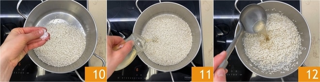 Salt 10 and, when the grains are hot to the touch, deglaze with white wine 11. Let the alcohol evaporate completely, then continue cooking the rice by adding one ladle of broth at a time 12.