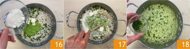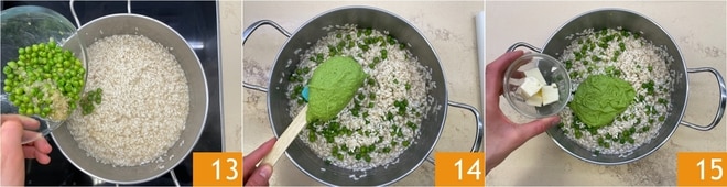 A couple of minutes before the end of cooking, add the whole peas 13 and mix well. Once ready, remove the risotto from the heat and incorporate the pea cream 14, then stir in the cold butter 15.