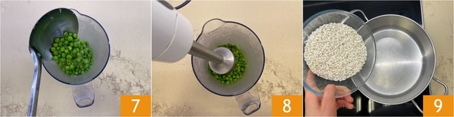 Take half of the cooked peas and place them in a jug 7. Blend with an immersion blender to obtain a smooth and homogeneous cream 8. Set aside and dry-toast the rice in another saucepan 9.