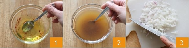 To make Milanese risotto in jar cooking, first prepare the Beef Broth: you will need about 230 grams (8 oz). Then put the saffron threads in a small bowl, add 60 grams (1/4 cup) of hot water, stir (1-2), and let it rest for 20 minutes. Peel and chop the onion: you will need 60 grams (1/2 cup) 3.