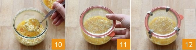 Divide the rice prepared in this way, with all its broth, into 2 jars with a capacity of 500 ml (2 cups) 10. Clean the edges of the jars, close them 11, and seal them with the appropriate clips 12. Let the rice rest inside the jars for 15 minutes, so it can absorb some of the liquid. Set the microwave to 500 watts, insert a jar, and start cooking for 6 minutes. Remove from the microwave and let rest with the jar closed for 20 minutes.