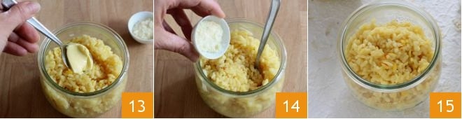 During the resting time, the cooking will be completed, and the vacuum will form. Meanwhile, cook the other jar. Now the Milanese risotto in jar cooking is ready; to open the jar and remove the vacuum comfortably, just unclip and place the jar in the microwave, starting at 750 watts for about 3 minutes. The push of the internal steam will gently open the lid. Once opened, add the butter 13 and grated cheese 14 to the rice, stir, and serve your Milanese risotto in jar cooking hot 15!