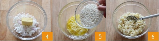 Transfer it to a glass bowl and add the butter 4. Place the bowl in the microwave and set it to 750 watts for 3 minutes. Pour the rice over the sautéed onion 5 and stir 6.