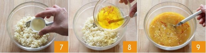 Add the white wine to the rice 7 and put the bowl back in the microwave for 2 minutes at 750 watts. Then pour in the liquid in which you have dissolved the saffron threads 8 and the broth, stir 9, and adjust the salt, only if necessary.
