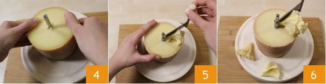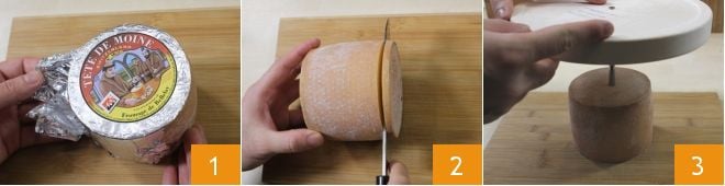 To prepare the pear and Tête de Moine risotto, unwrap the cheese 1, cut off the cap 2 and place the cheese, cut side down, on a cutting board. Insert the Girolle spindle into the center of the cheese 3 and