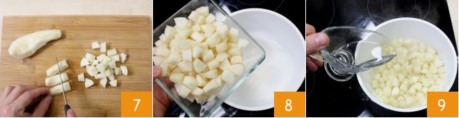 Peel and dice the pears 7, then put them in a small pot 8 and drizzle with 50 ml of white wine, taken from the total amount 9, and a ladle of broth, and cook them for a few minutes.