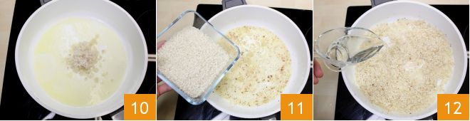 Finely chop the shallot and let it soften over low heat in a large saucepan with the butter 10. Then add the rice and toast it 11. When the rice is transparent, deglaze with the remaining 100 ml of white wine 12.