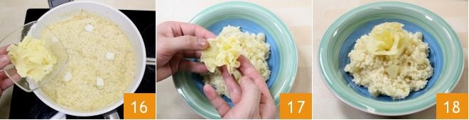 Continue cooking the risotto, adding a ladle of broth whenever necessary, and when the risotto is cooked, turn off the heat and stir in the butter and another 1.25 oz of Tête de Moine 16. Serve the pear and Tête de Moine risotto hot, garnishing it with a beautiful cheese rosette in the center of the plate (17-18)!
