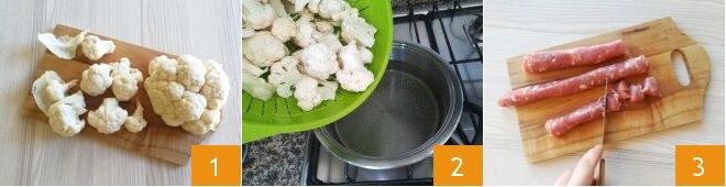 To make the risotto with cauliflower, sausage, and brie, first prepare the vegetable broth, then deal with the cauliflower: remove the outer leaves, discard the stalk, separate the florets 1, and rinse them under running water. Bring a pot of lightly salted water to a boil, add the cauliflower 2, and blanch it for about 7-8 minutes. Meanwhile, cut the sausage into small pieces, after removing the casing 3, and thinly slice the onion.