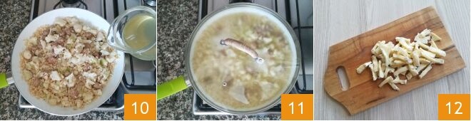 then pour the boiling broth into the pan 10, stir again, lower the heat, and cover with a lid 11. Let it cook for about 15-16 minutes, stirring often and adding more hot broth if it dries out too much. Meanwhile, cut the brie cheese into cubes or strips 12.