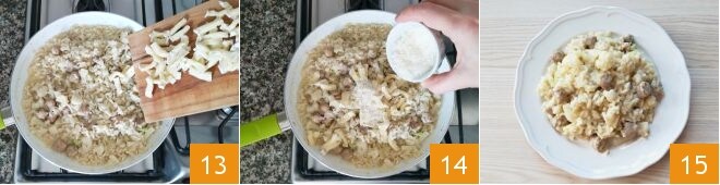 After the cooking time, turn off the heat and mix with the brie 13 and grated Grana Padano PDO 14. Stir for about a minute to blend the cheeses well and serve your risotto with cauliflower, sausage, and brie hot 15!