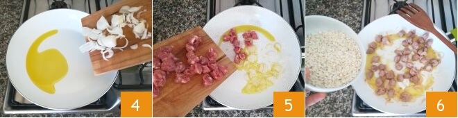 Heat the oil in a large pan, add the onion 4 and sausage 5, and sauté over medium heat for 2-3 minutes, stirring often. Once the sausage is browned, pour the rice into the pan 6