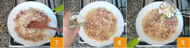 and toast it for a few minutes, continuing to stir 7. When the rice becomes translucent, deglaze with the white wine 8 and let it evaporate completely. At this point, add the blanched cauliflower 9 and mix well,
