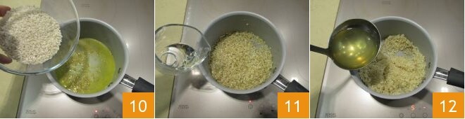 When it is wilted, add the rice 10 and let it toast for a few minutes. Then deglaze with white wine 11. When the wine has evaporated, add a ladle of Vegetable broth 12. Stir the risotto from time to time and continue to add a ladle of broth, only when the previous one has been completely absorbed.