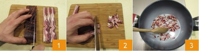 To make the risotto with bacon, peas, and marjoram, slice the smoked bacon 1, then cut it into strips 2, and brown the bacon in a pan without adding any additional fats 3