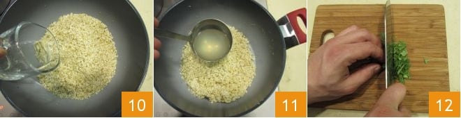 Deglaze with white wine 10, add a couple of ladles of hot vegetable broth 11, and let it cook by adding the broth as needed, one ladle at a time, for 10 minutes. It is important not to add too much broth at once; it should be added as the rice absorbs it. Meanwhile, wash, dry, and chop the marjoram 12.