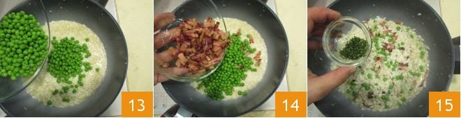 When there are a few minutes left to the end of cooking, add the peas 13 and the bacon 14, season with marjoram 15, and adjust the salt and pepper.