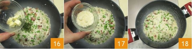 Turn off the heat and stir the risotto with butter 16 and grated cheese 17. Your risotto with bacon, peas, and marjoram is ready to be enjoyed hot 18.