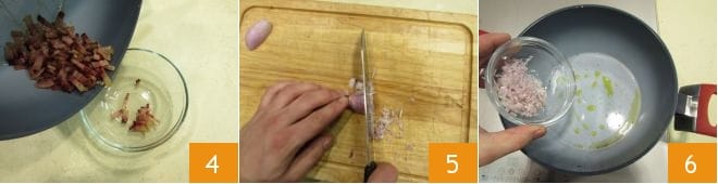 when it is crispy, transfer it to a bowl 4. Peel and chop the shallot 5, heat the olive oil in the same pan used for the bacon, and then add the chopped shallot 6