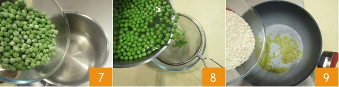 let it wilt over low heat for at least 5 minutes. In the meantime, blanch the peas in boiling water for 3-4 minutes 7 then drain them 8. When the shallot is soft, add the rice 9 and toast it, stirring with a wooden spoon.
