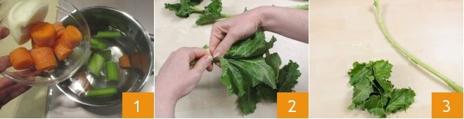 To prepare the risotto with turnip greens, start by making the vegetable broth needed for cooking the risotto: wash a carrot and a celery stalk and cut them into large pieces, peel half an onion, place the vegetables in a pot filled with water 1, bring to a boil, then salt. Cover with a lid and cook for about an hour and a half. Clean the turnip greens: remove the wilted leaves, the hard and fibrous outer stems, and keep the smaller, tender inner ones, setting aside the leaves and tender stems (2-3).