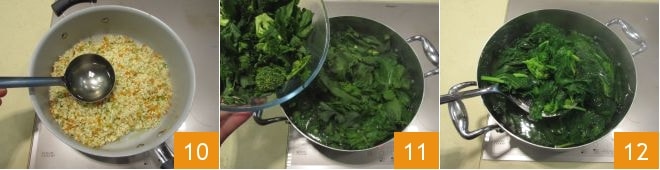 and add a ladle of vegetable broth 10, continue cooking by adding the broth one ladle at a time. In a large pot, bring water to a boil, add both the leaves 11 and the florets 12, and blanch them for 2-3 minutes,